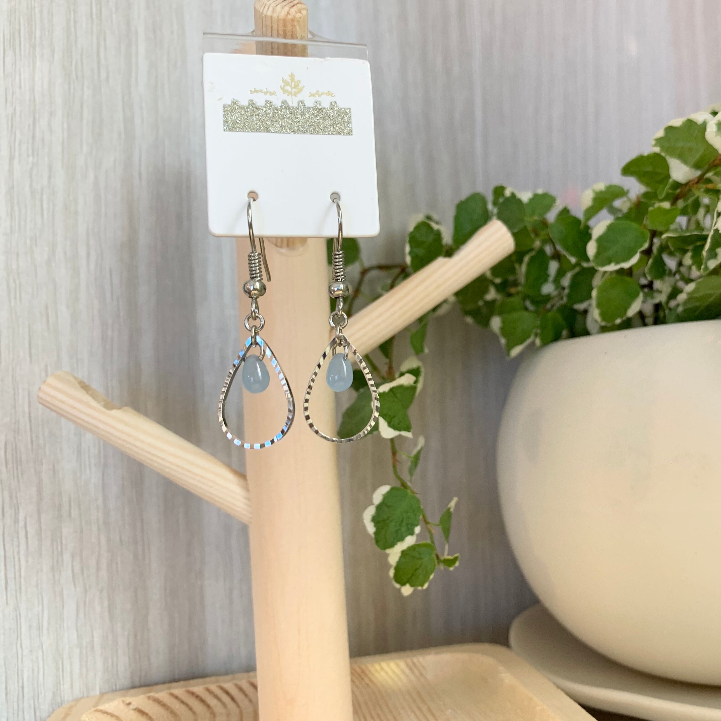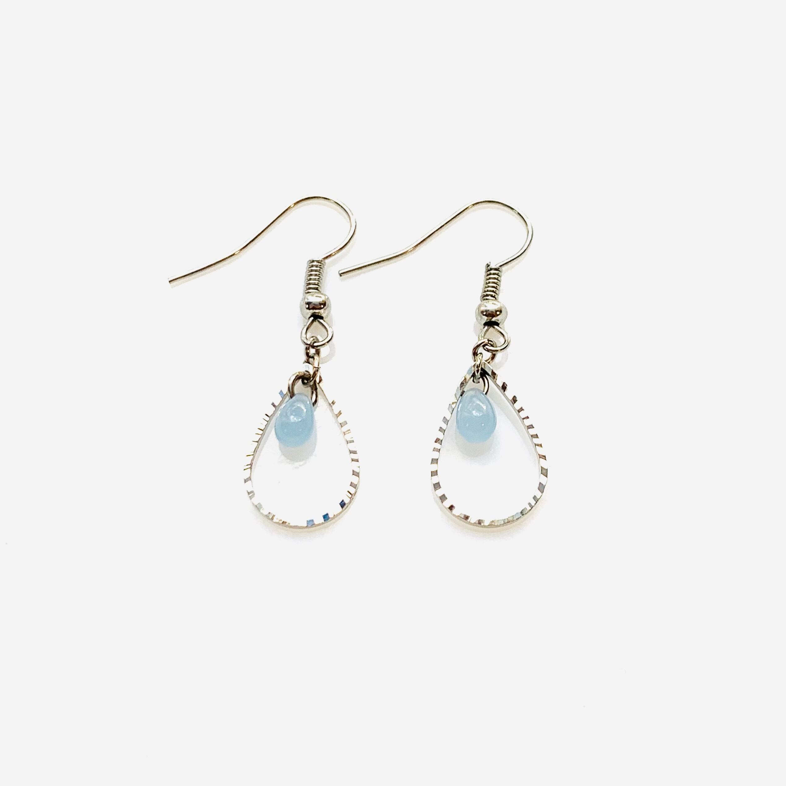 シルバーの柄入り枠に水色の小さな雫パーツを合わせたピアスです。