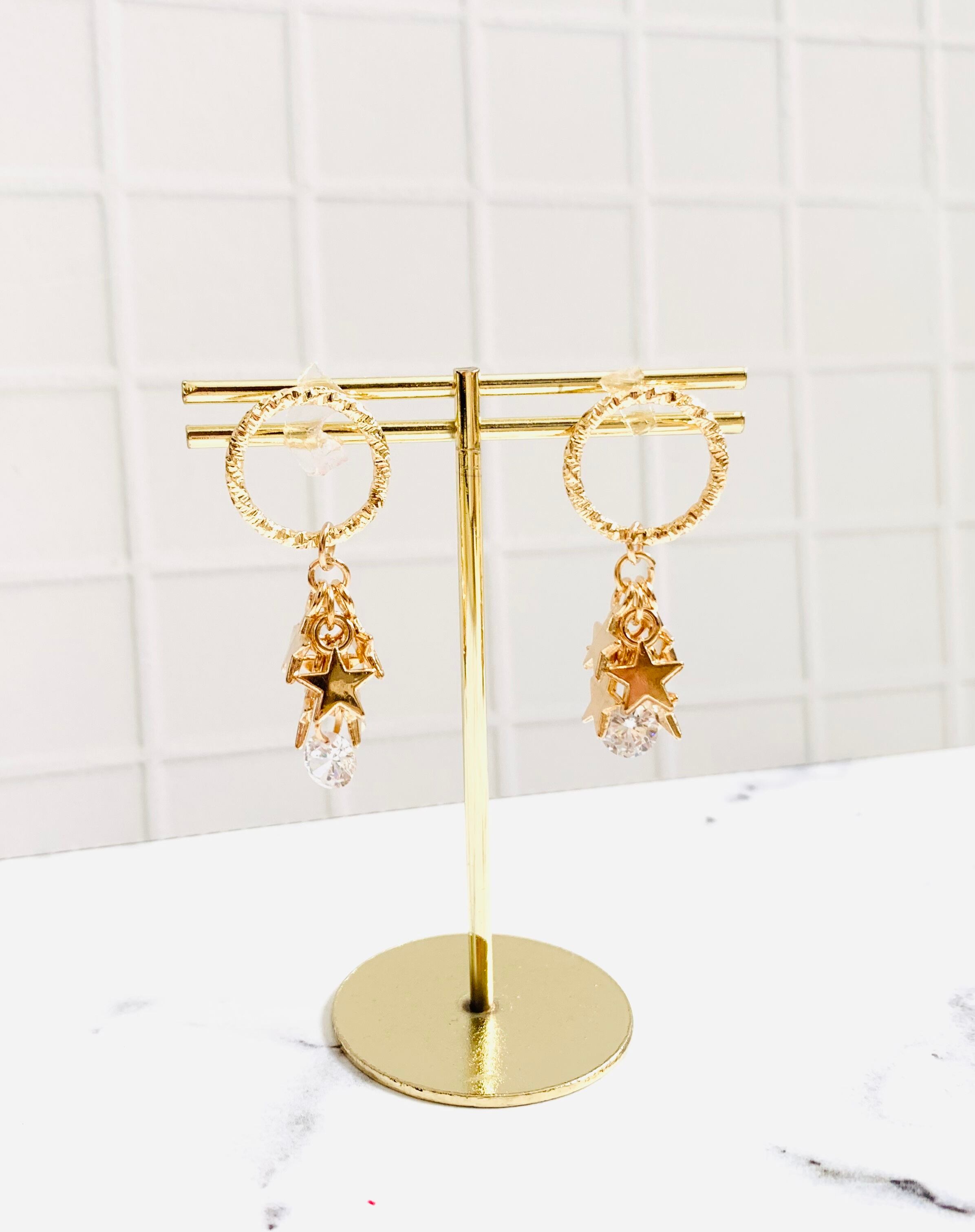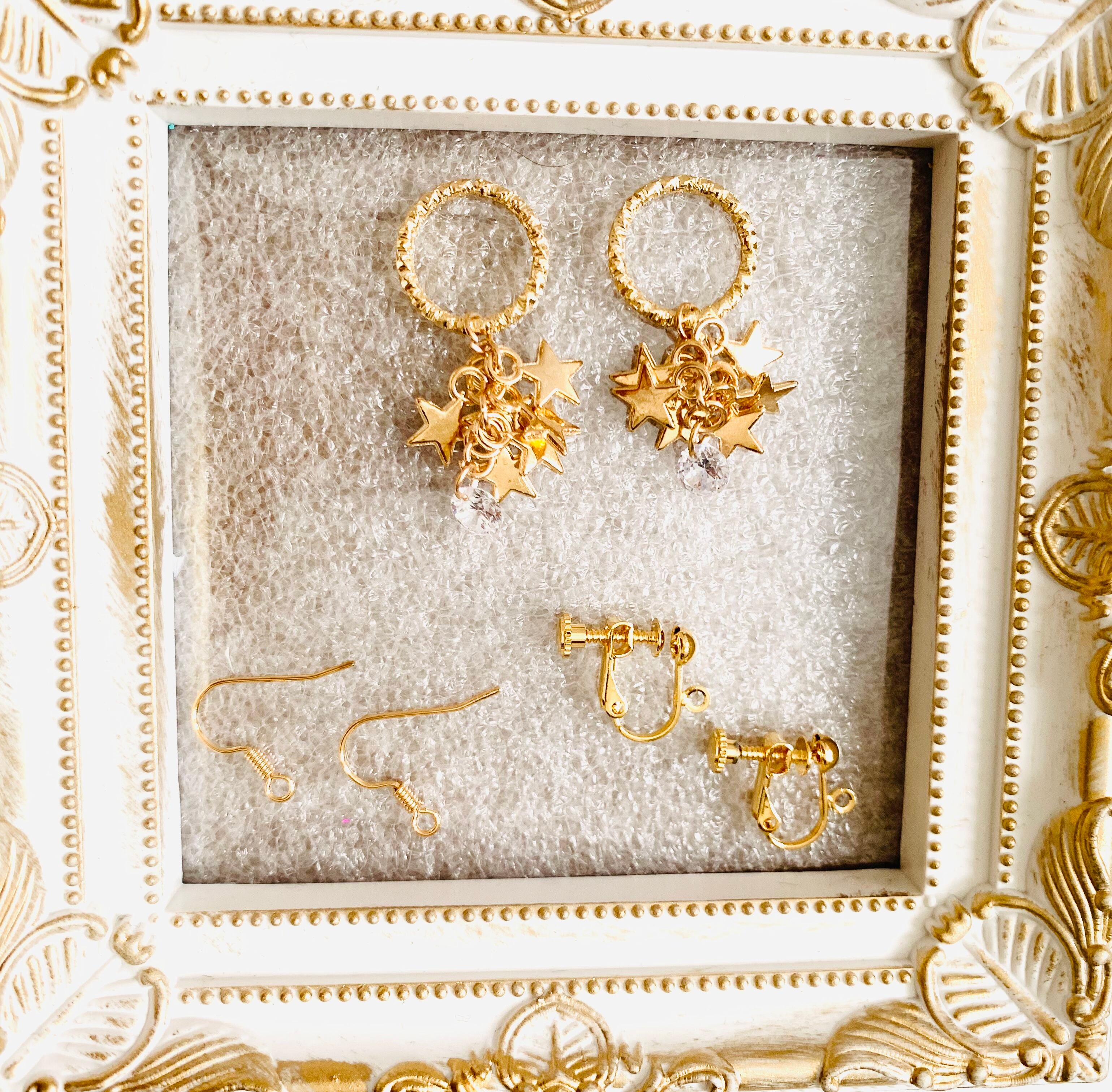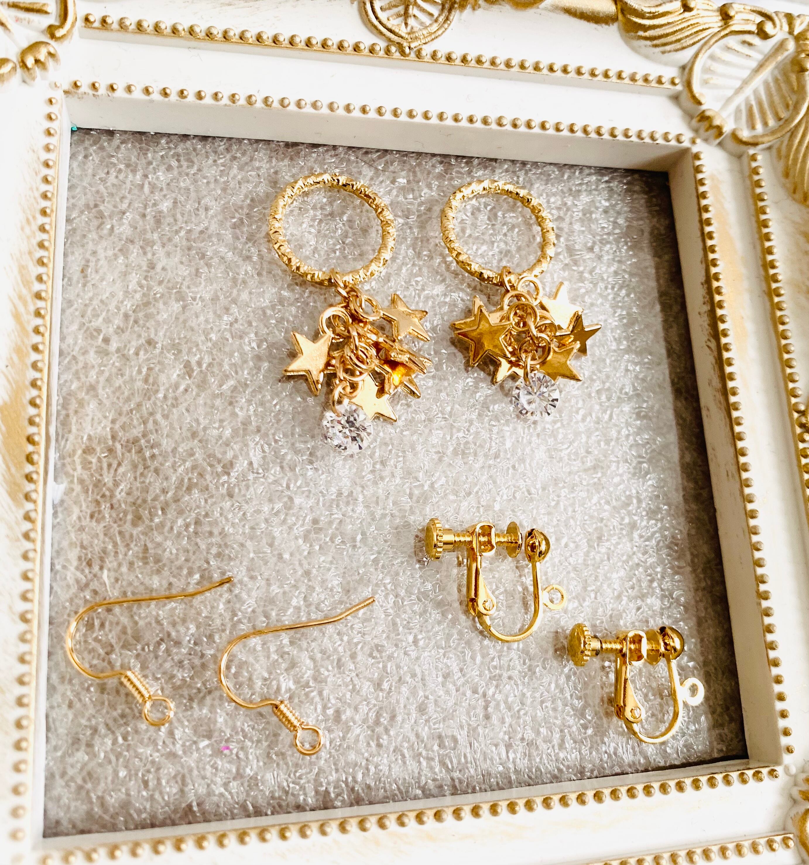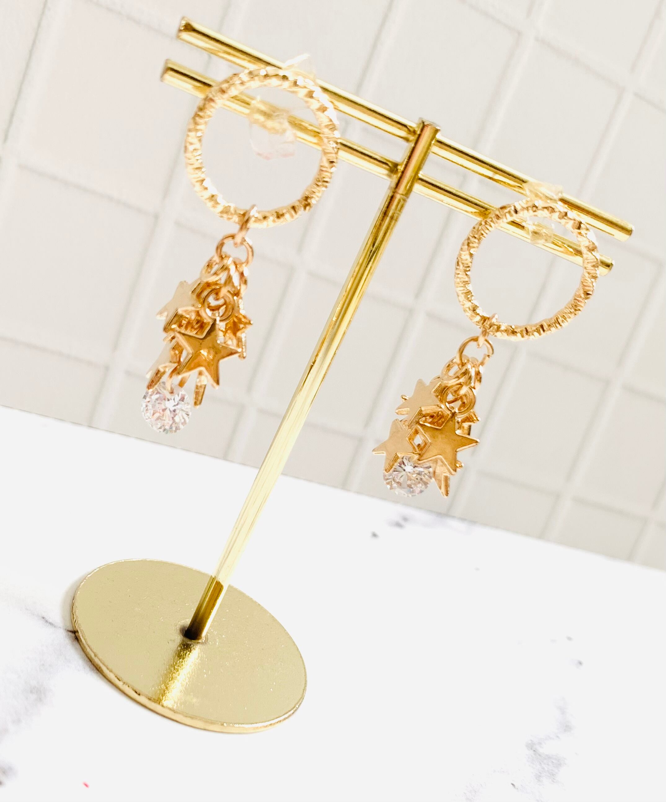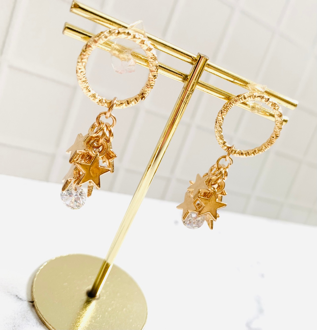 デザインの入ったゴールドフープにたくさんの星のチャームをつけて流れ星のようなデザインにしました。